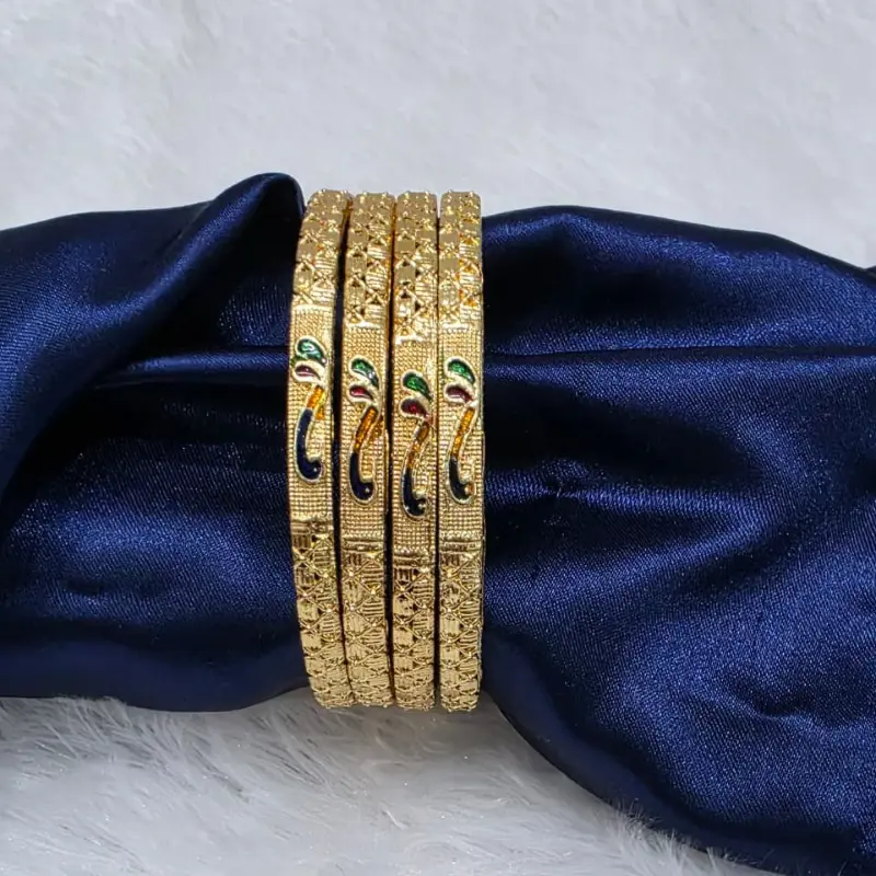Adorn your wrists with the timeless beauty of these exquisite golden bangles. This stunning set features four meticulously crafted bangles, each showcasing a delicate peacock motif enameled in vibrant hues of blue, green, and red. The intricate detailing and brilliant gold finish create a captivating sparkle that will elevate any outfit.