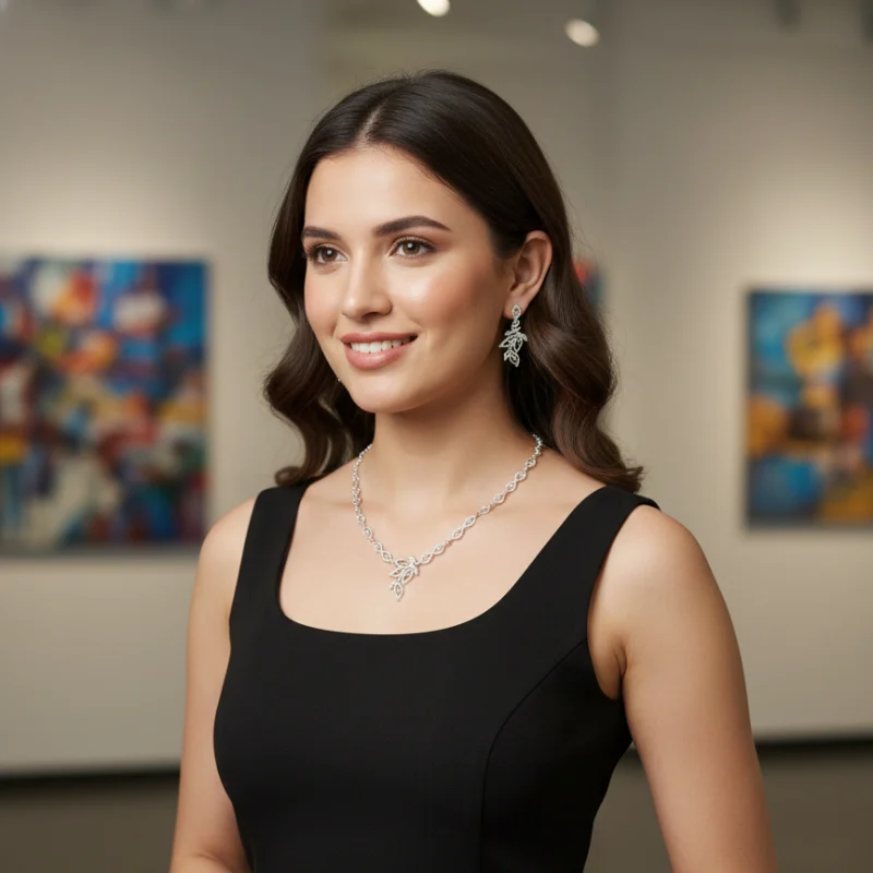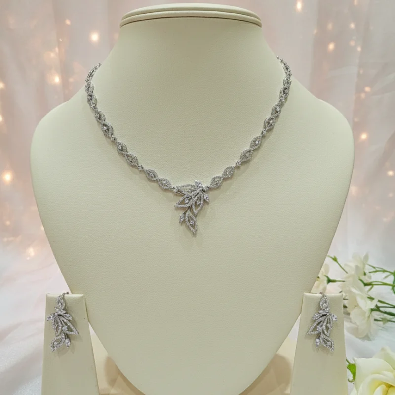 Elevate your jewelry collection with this exquisite Premium Cubic Zirconia Necklace and Earring Set. Designed for the modern woman who appreciates the fine balance between classic nature-inspired motifs and contemporary brilliance, this set is a masterpiece of craftsmanship.