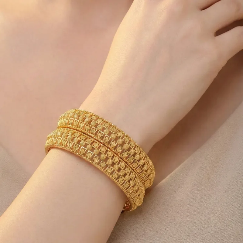 Elevate your traditional or contemporary look with this stunning pair of gold-toned bangles. Featuring an intricate open-work grid design, these bangles showcase exceptional craftsmanship and attention to detail. The detailed filigree pattern catches the light beautifully, offering a rich, opulent texture without excessive weight. Perfect for weddings, festivals, or adding a touch of premium elegance to your daily wear.