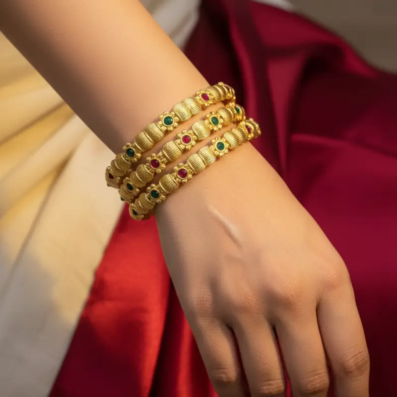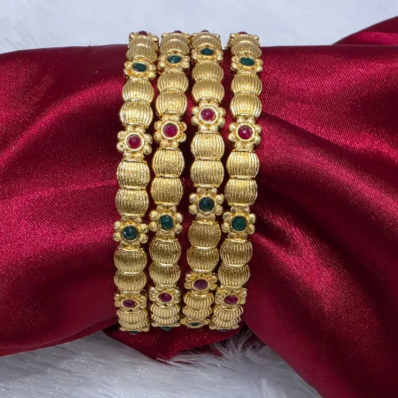 Elevate your traditional wear with this gorgeous set of four gold-toned bangles. Featuring an intricate ribbed texture and floral motifs, each bangle is embellished with alternating deep ruby red and vivid emerald green cabochon stones. A timeless piece that perfectly blends traditional craftsmanship with a touch of color, ideal for weddings, festivals, and special occasions.