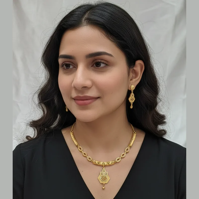 Elevate your look with this stunning, premium gold-toned necklace and earring set. Designed for the discerning individual, this piece perfectly blends classic charm with contemporary grace.