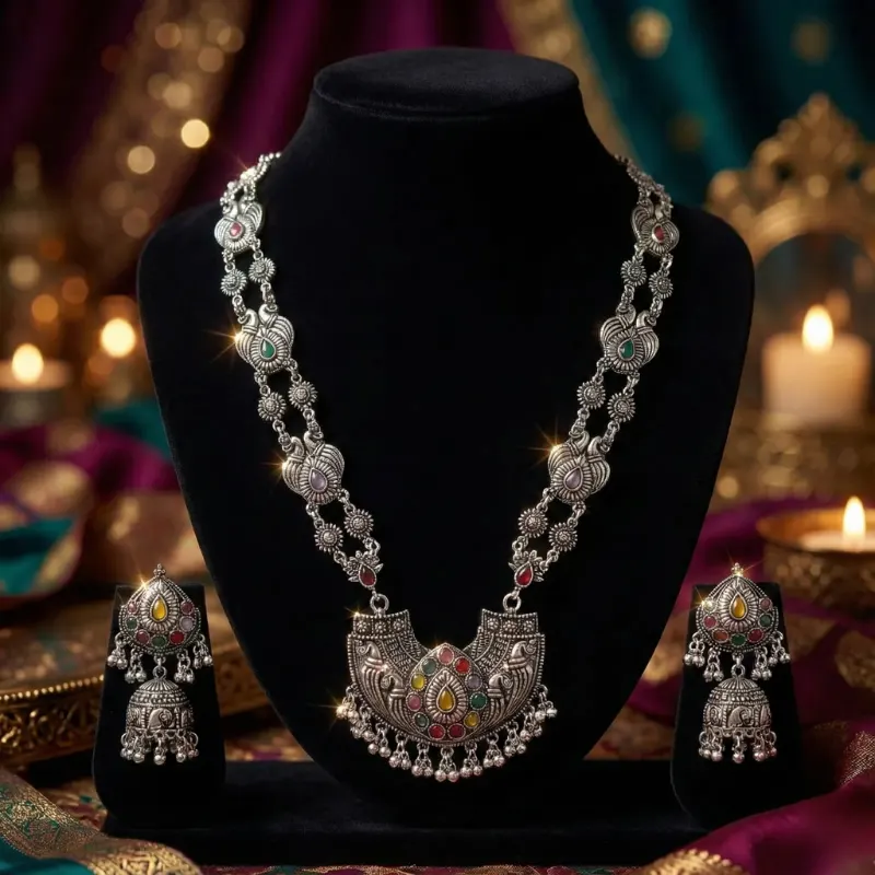 Exquisite Oxidised Silver Necklace and Earring Set