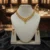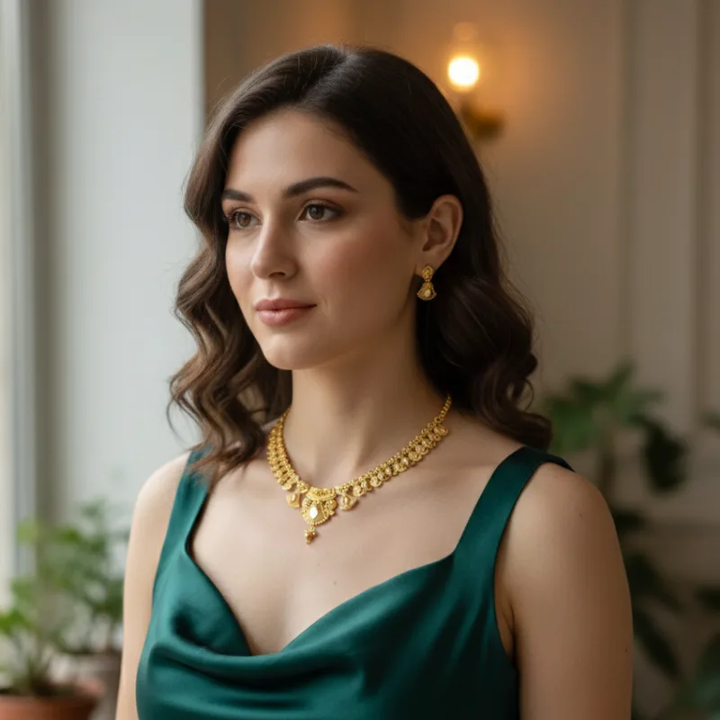 • The Necklace: Features a refined collar-style design, meticulously crafted with repeating floral and leaf motifs. The centerpiece is an intricate, scalloped pendant with delicate gold-bead droppings, creating a focal point that sits gracefully along the collarbone.