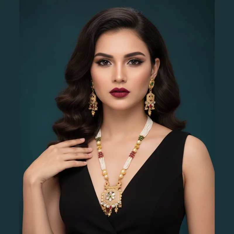 Elevate your traditional or festive look with this stunning, premium multi-strand necklace and earring set. Expertly crafted, this piece beautifully blends classic elegance with intricate Rajasthani-inspired artistry.