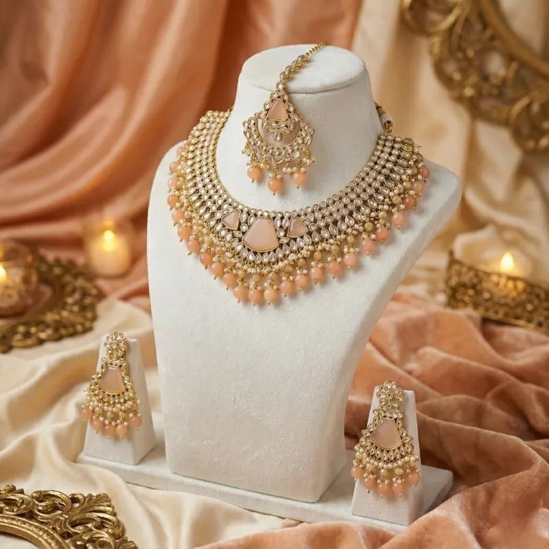 • Color Palette: Luxurious gold-tone metal, brilliant white Kundan stones, and romantic peachy-pink accents.