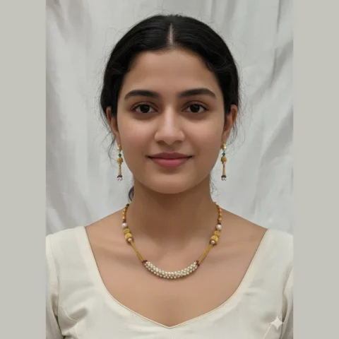 • Matching Earrings (Jhumkas/Chandbalis style): Two stunning earrings that mirror the necklace’s design, featuring the signature colored stone, Kundan detailing, and a cluster of dangling pearls.