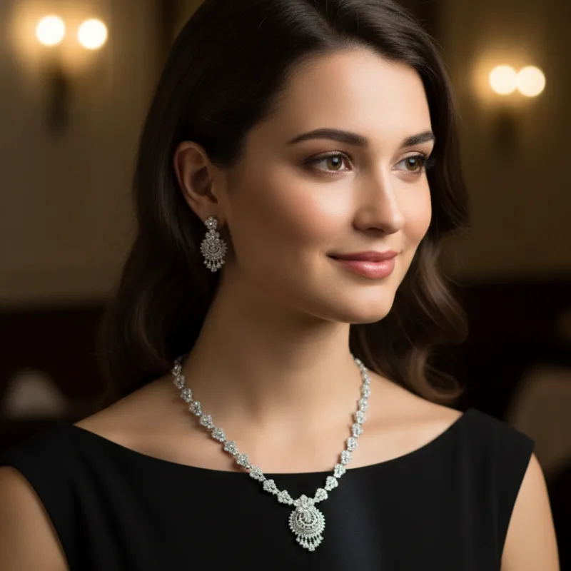 The Necklace: A delicate yet impactful chain of shimmering floral motifs leads to a breathtaking crescent-style pendant. The center drop features intricate lattice work and a tiered “chandelier” effect that catches the light from every angle.