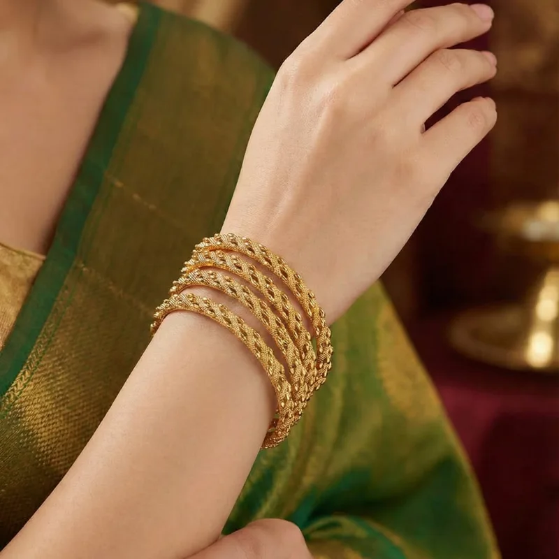 Elevate your look with this stunning set of four Premium Gold-Plated Bangles. Featuring an intricate twisted rope design with delicate, studded edges, these bangles offer the timeless appeal of gold with a modern, textured finish. Perfect for daily wear or special occasions, this set is a must-have addition to your jewelry collection.
