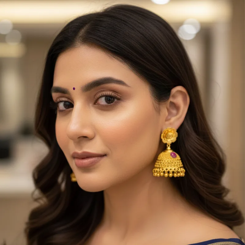 • Finishing Touch: The lower edge of the jhumka is decorated with a cascade of rounded, gold-toned droplets, ensuring beautiful movement and a soft, captivating jingle with every turn of the head.