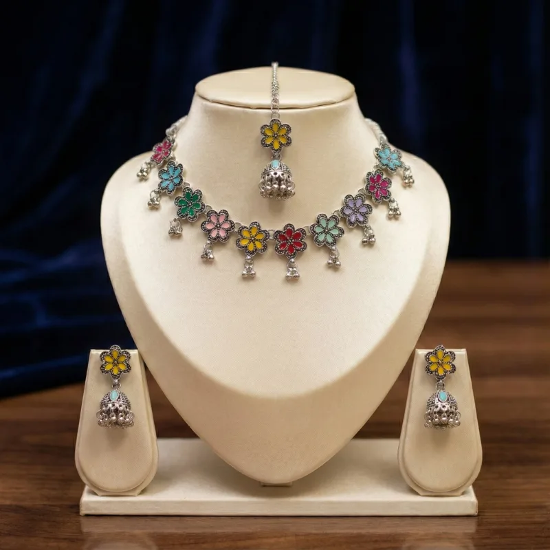 Hand-finished by skilled artisans, the set combines the beauty of traditional Indian jewelry techniques with a fresh, contemporary design. The premium oxidation ensures durability, while the bright enamel colors are fade-resistant, promising a piece you will cherish for years.