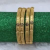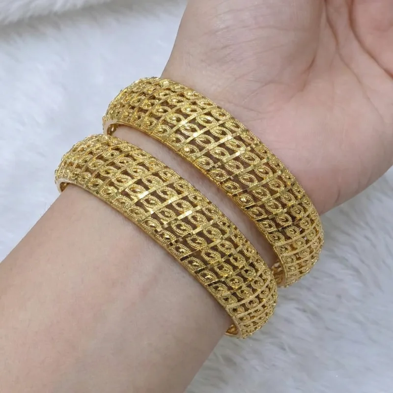 Experience the grandeur of traditional jewelry modernized for the contemporary wearer. This exquisite set includes two matching broad bangles, masterfully crafted with a unique, open-work leaf-and-vine motif. The detailed cutout design provides a dazzling texture and remarkable shimmer with every movement.