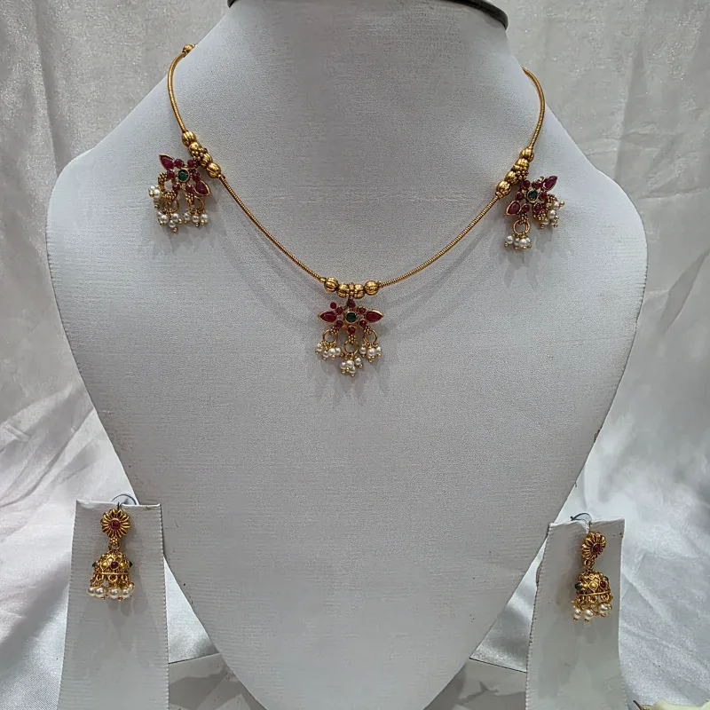 Elevate your traditional ensemble with this exquisite, handcrafted choker-style necklace set. Inspired by classic South Indian temple jewelry, this piece features a delicate gold-tone chain accented with miniature golden beads. It’s the perfect blend of traditional elegance and contemporary wearability.