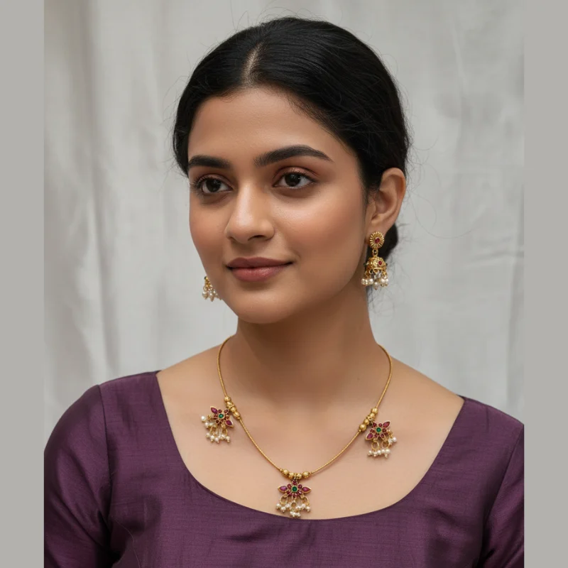 Intricate Pendants: The set features three beautifully crafted, floral-inspired pendants. Each pendant is embellished with vibrant Kemp stones (ruby and emerald colored stones) and fringed with delicate, dangling faux pearls.