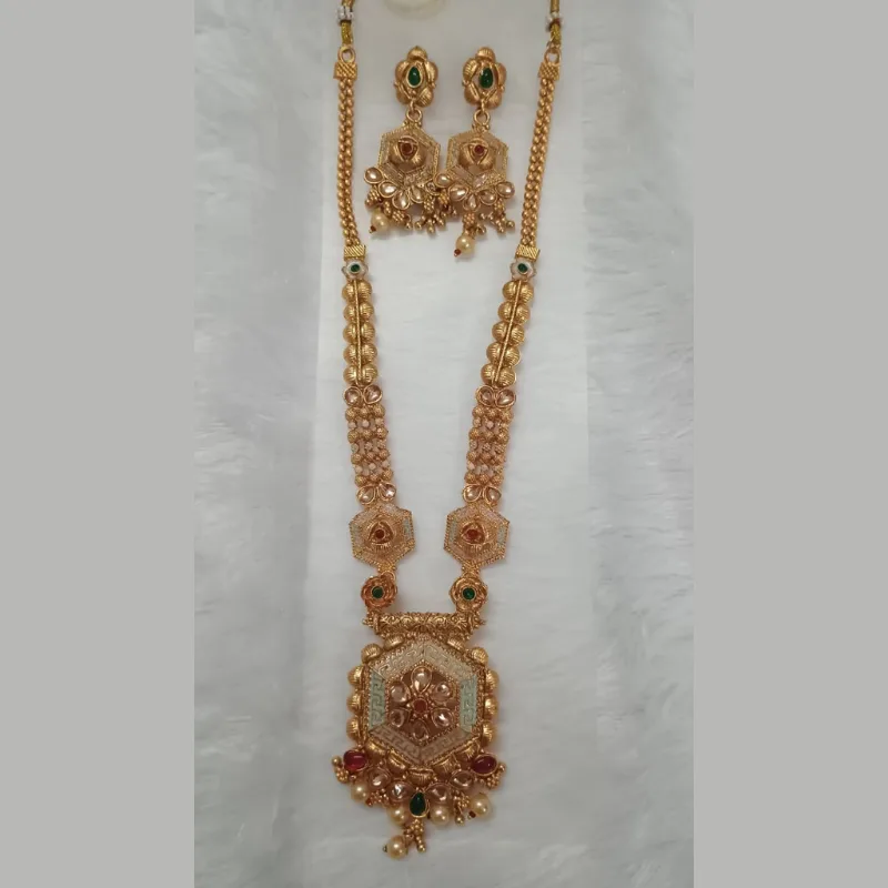 Indulge in the timeless artistry and opulent charm of this exquisite Gold-Plated Long Necklace Set, a perfect embodiment of traditional Indian craftsmanship. Designed to add a touch of regal grandeur to your most special occasions, this piece is a must-have for the discerning collector.